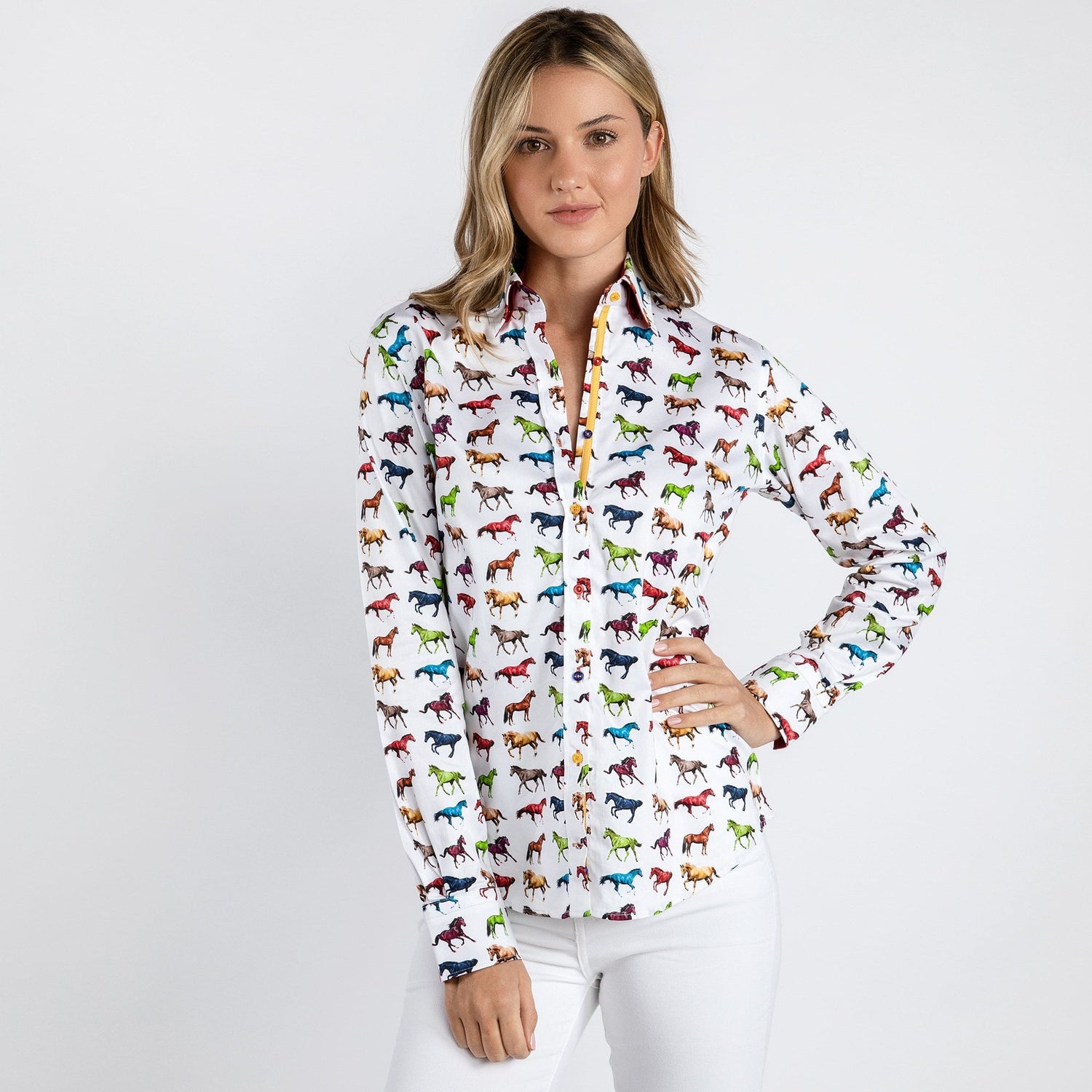 MULTI COLOURED GALLOPING HORSES WOMENS PRINT SHIRT