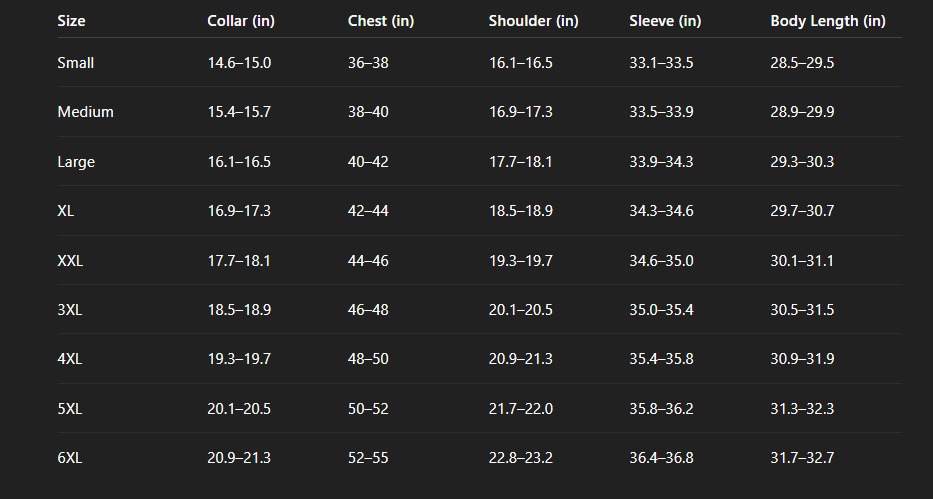 - We offer 9 shirt sizes (Small–6XL), giving you more choice and more precise increments than most brands.
