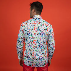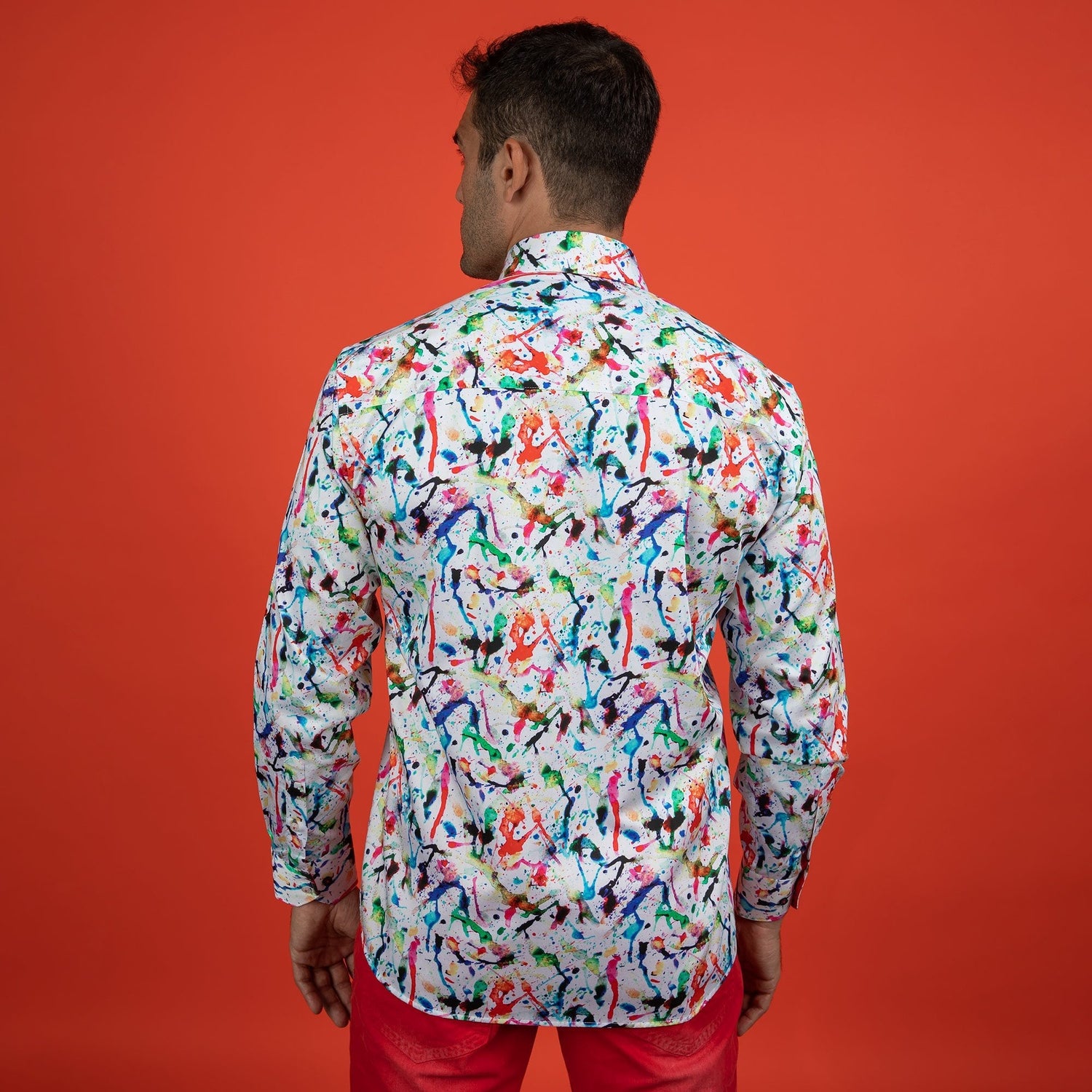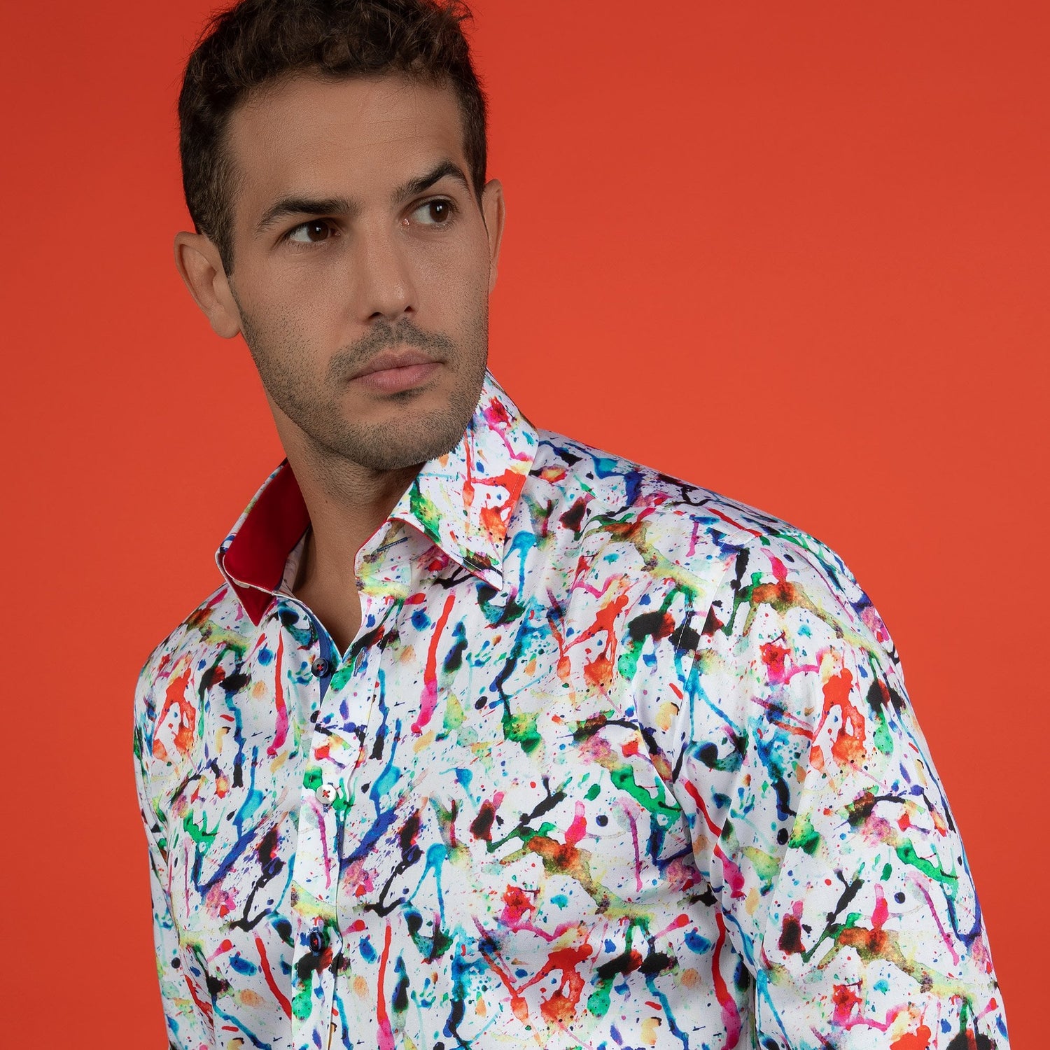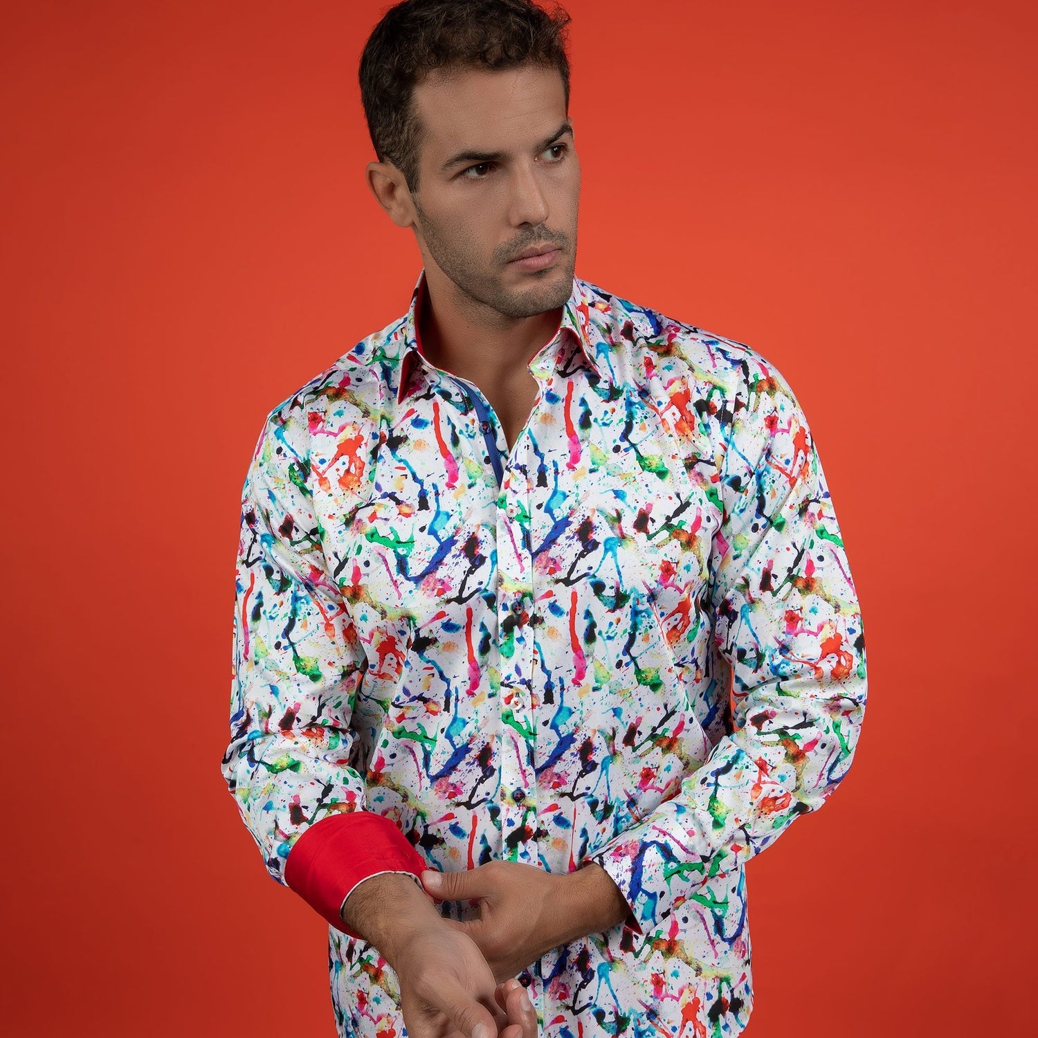 Unleash your inner artist with the Art Attack Paint Splash Shirt. This shirt is a vibrant masterpiece, designed for those who aren't afraid to make a bold statement. The chaotic splashes of color are reminiscent of a painter’s canvas, bringing energy and creativity to your wardrobe. Crafted from a luxurious satin-cotton blend, it’s not just about looks—comfort is key. Pair this with sharp trousers for an art gallery opening or casual jeans for a weekend brunch. Wherever you wear it, you're guaranteed to be the focal point of the room.