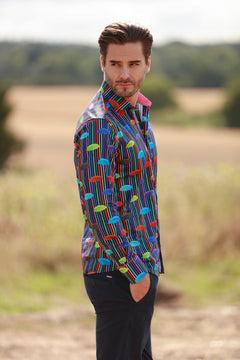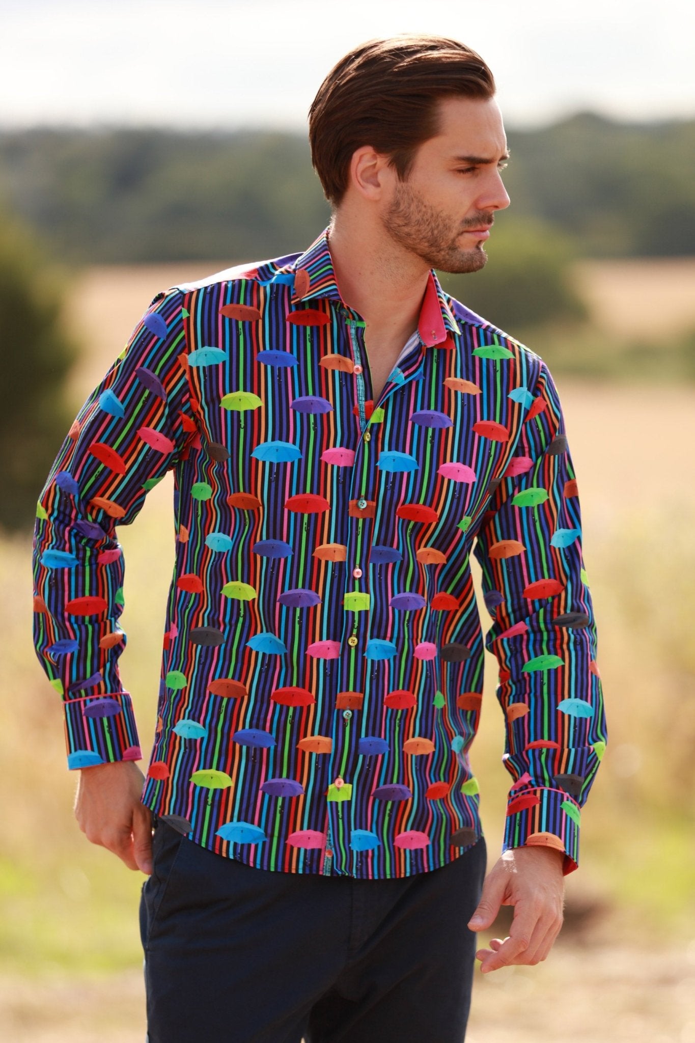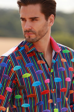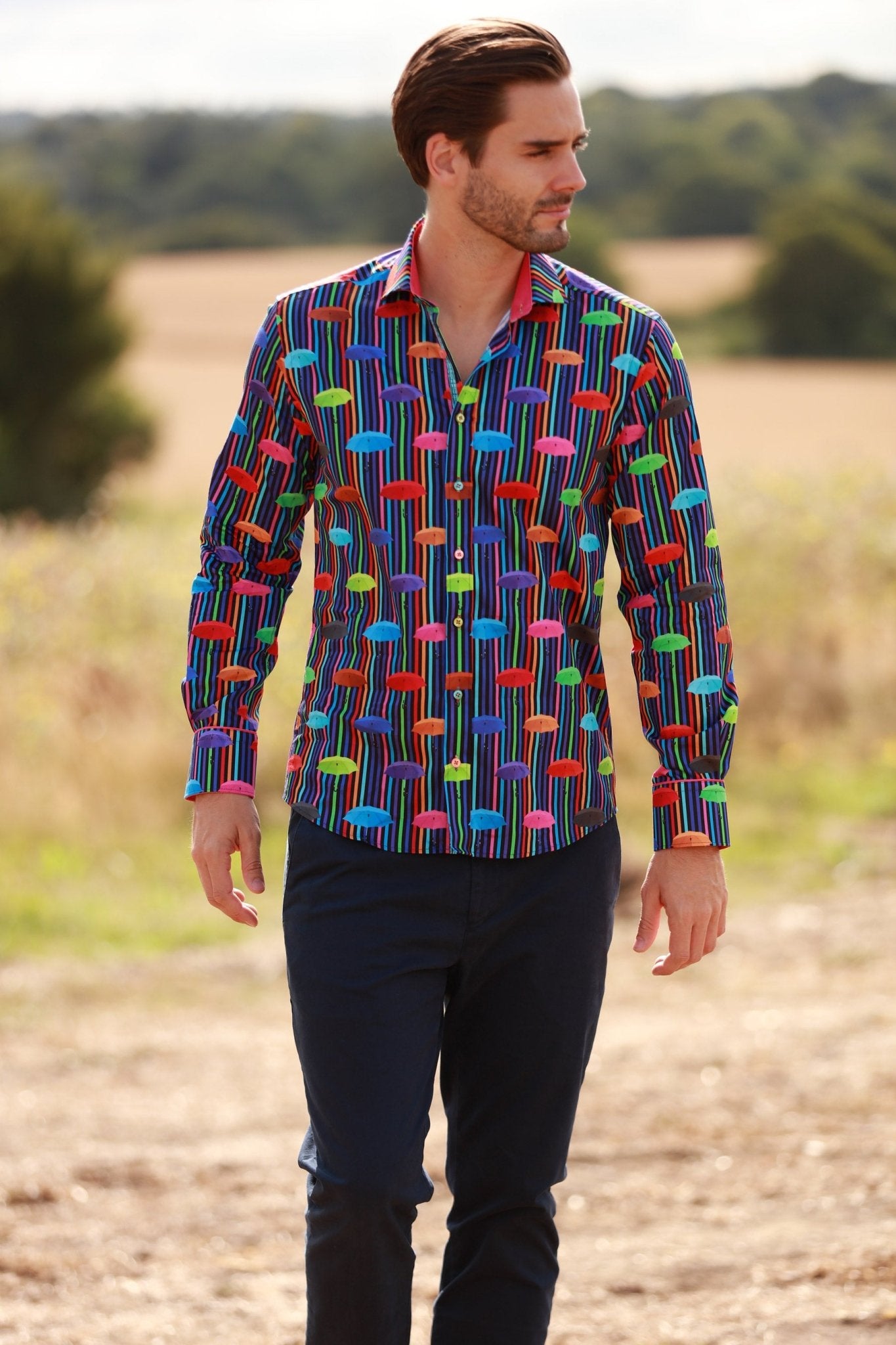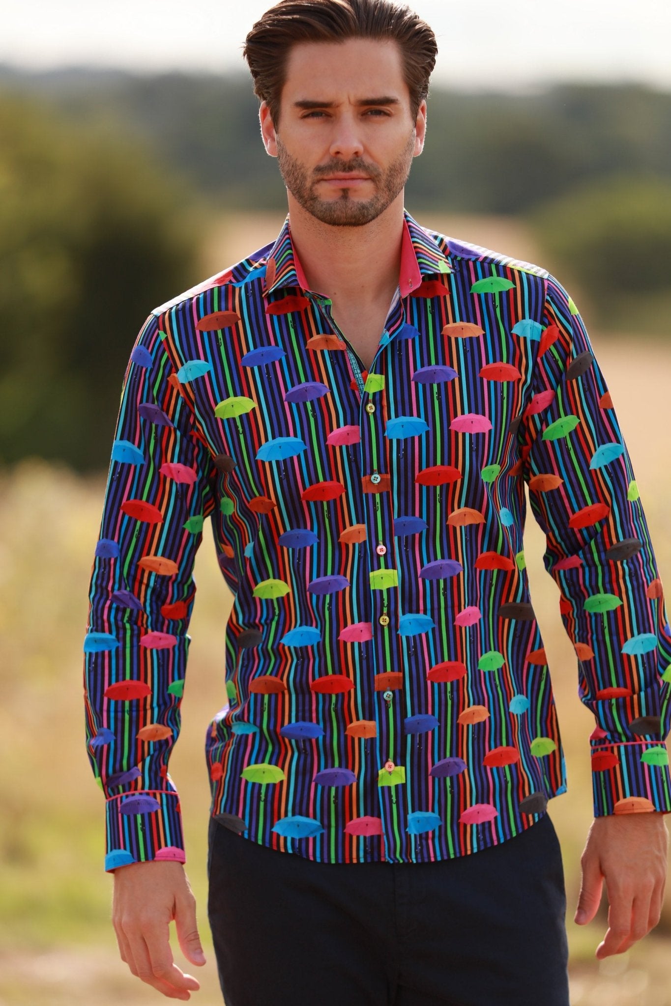 Step into a world where function meets fun with the Umbrella Floating Stripe Print Shirt by Claudio Lugli. Perfect for those who enjoy a bit of whimsy in their wardrobe, this shirt features vibrant, multicolored umbrellas "floating" against a backdrop of dynamic, wavy stripes. The rainbow-hued buttons add an extra pop, turning a rainy day staple into a conversation starter. Whether you're aiming to brighten up a dreary day or just want to stand out in a sea of mundane fashion, this shirt has got you covered—literally and figuratively.