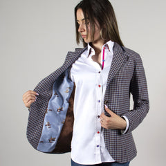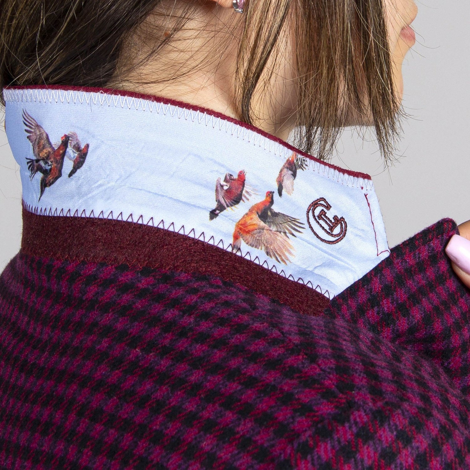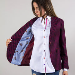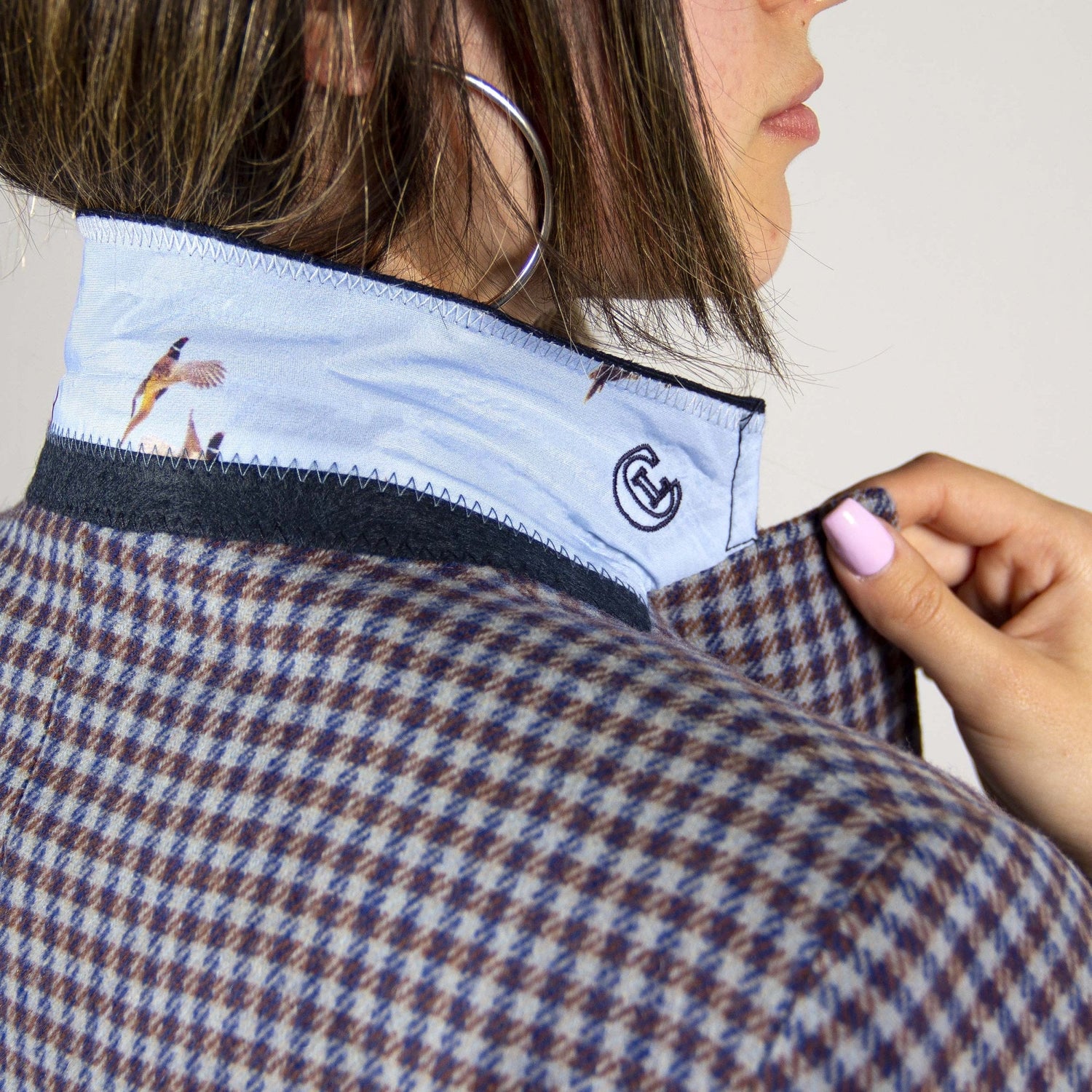 Warm wool material topped with vibrant piping along the lapel and flap pockets. Luxurious flying red Grouse print and a sky blue wash for the inner lining.