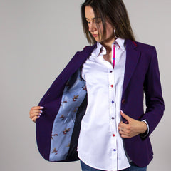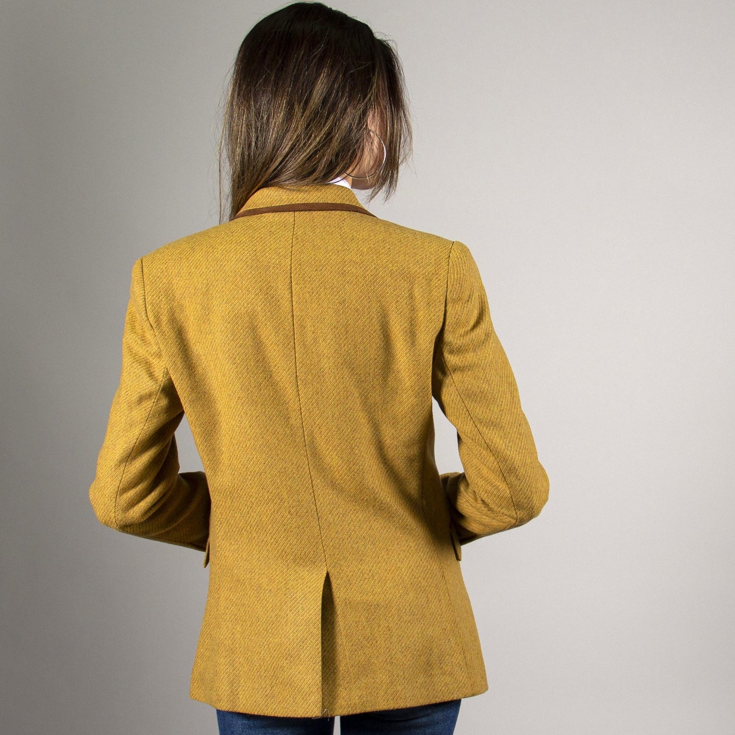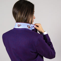 Warm wool material topped with vibrant piping along the lapel and flap pockets. Luxurious flying pheasant print and a sky blue wash for the inner lining.