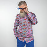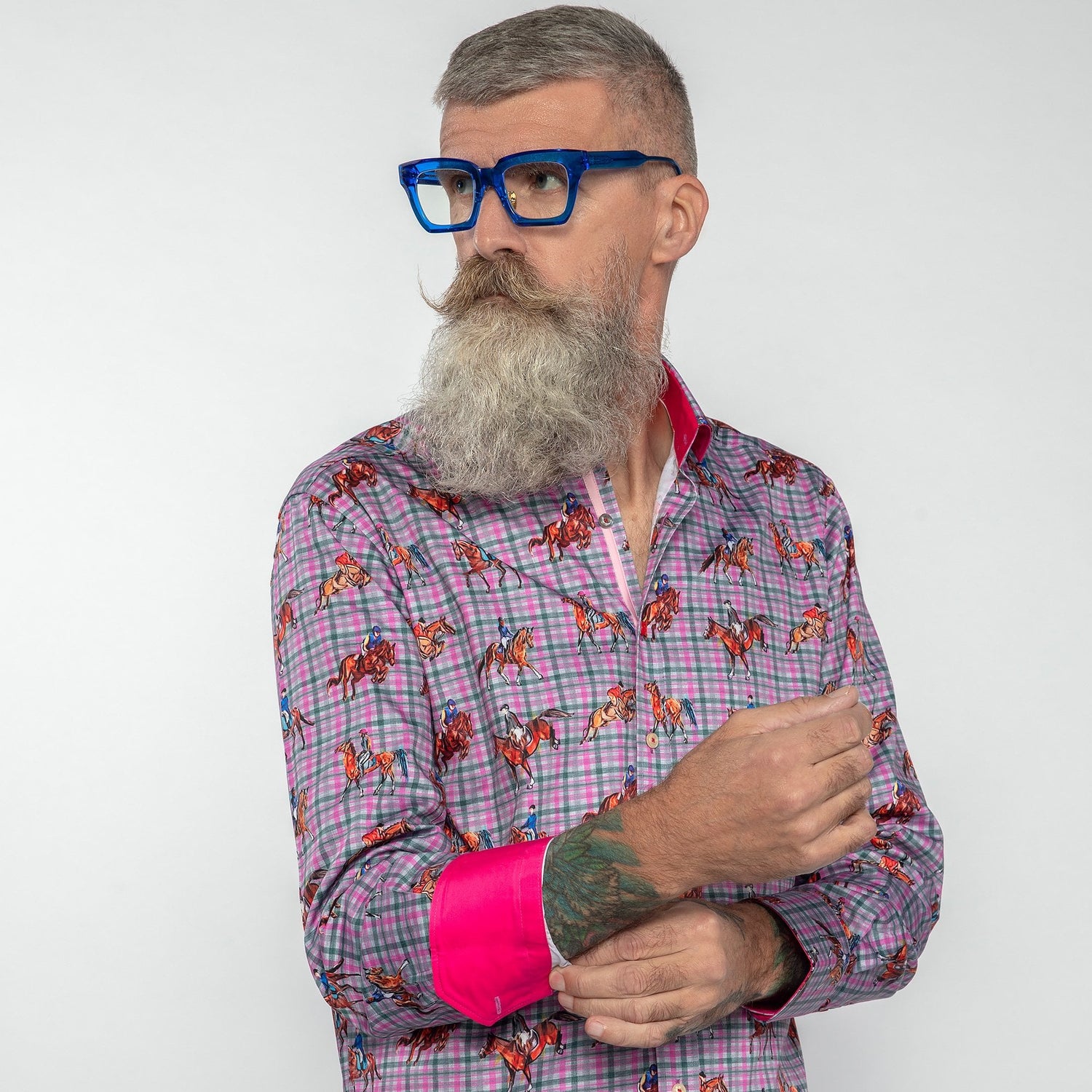 This unique shirt merges a classic check pattern with lively dressage horse illustrations, adding a touch of equestrian elegance to a traditional design. The vibrant reds and blues of the horse print contrast beautifully against the pink plaid, creating a bold statement piece. Ideal for those looking to add playful sophistication to their wardrobe. Suitable for both casual and semi-formal occasions, this shirt brings artistry and sport together effortlessly.