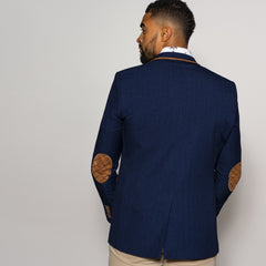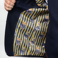 Crafted in a rich navy color, the jacket features a striking skull lining that adds a bold twist to its sophisticated exterior. The double button front and single back vent ensure a tailored fit, while the welt pocket with flap and four-button cuff add refined touches.
