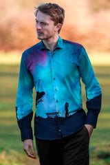 Crafted from a luxurious satin-cotton blend, this shirt provides an ultra-soft feel with a tailored fit, ensuring both comfort and elegance. The contrasting deep navy cuffs and collar, along with subtle button detailing, enhance its sophisticated appeal. Whether you're looking to make a bold fashion statement or channel the mystique of the night sky, this one-of-a-kind design is your go-to piece.