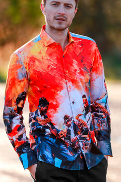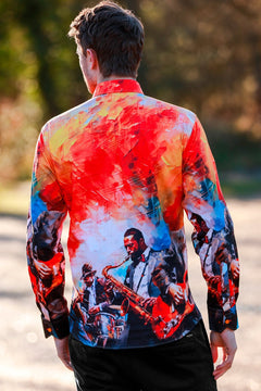 Set against a backdrop of fiery reds and deep blues, the scene exudes movement, as if the melody itself is imprinted onto the fabric. Intricate musical notes weave through the composition, amplifying the sense of rhythm and energy. The contrasting cuffs and placket add a refined touch, ensuring this statement piece is as elegant as it is bold.