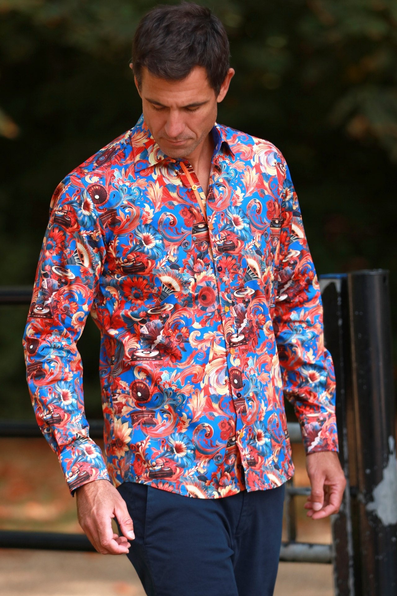 Dive into a kaleidoscope of colors and vintage vibes with The Psychedelic Symphony Shirt. This bold, eye-catching design blends intricate floral swirls with the charm of vintage gramophones, creating a harmonious fusion of art and nostalgia. Whether you're making a statement at a music event or elevating your everyday look, this shirt is your ticket to stand-out style.