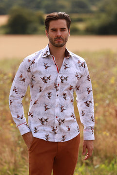 Embrace the tranquility of the countryside with the Partridges Flying Print Shirt. This shirt features a serene and elegant design with detailed prints of partridges in flight, set against a subtle background. Ideal for nature lovers and those who appreciate a touch of the outdoors in their wardrobe, this shirt brings a refined yet rustic charm to any outfit. Crafted from premium cotton, it offers both comfort and style, making it a versatile addition to your collection. Perfect for casual outings or adding a bit of flair to a more formal look.