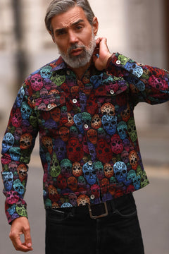 What sets this piece apart is its vibrant, multi-colored skull print, a bold yet refined design that’s perfect for those who dare to stand out. Whether you’re layering it over a tee for a casual look or buttoning it up for a more polished outfit, this shirt brings both edge and versatility to your wardrobe.