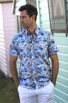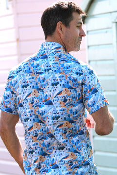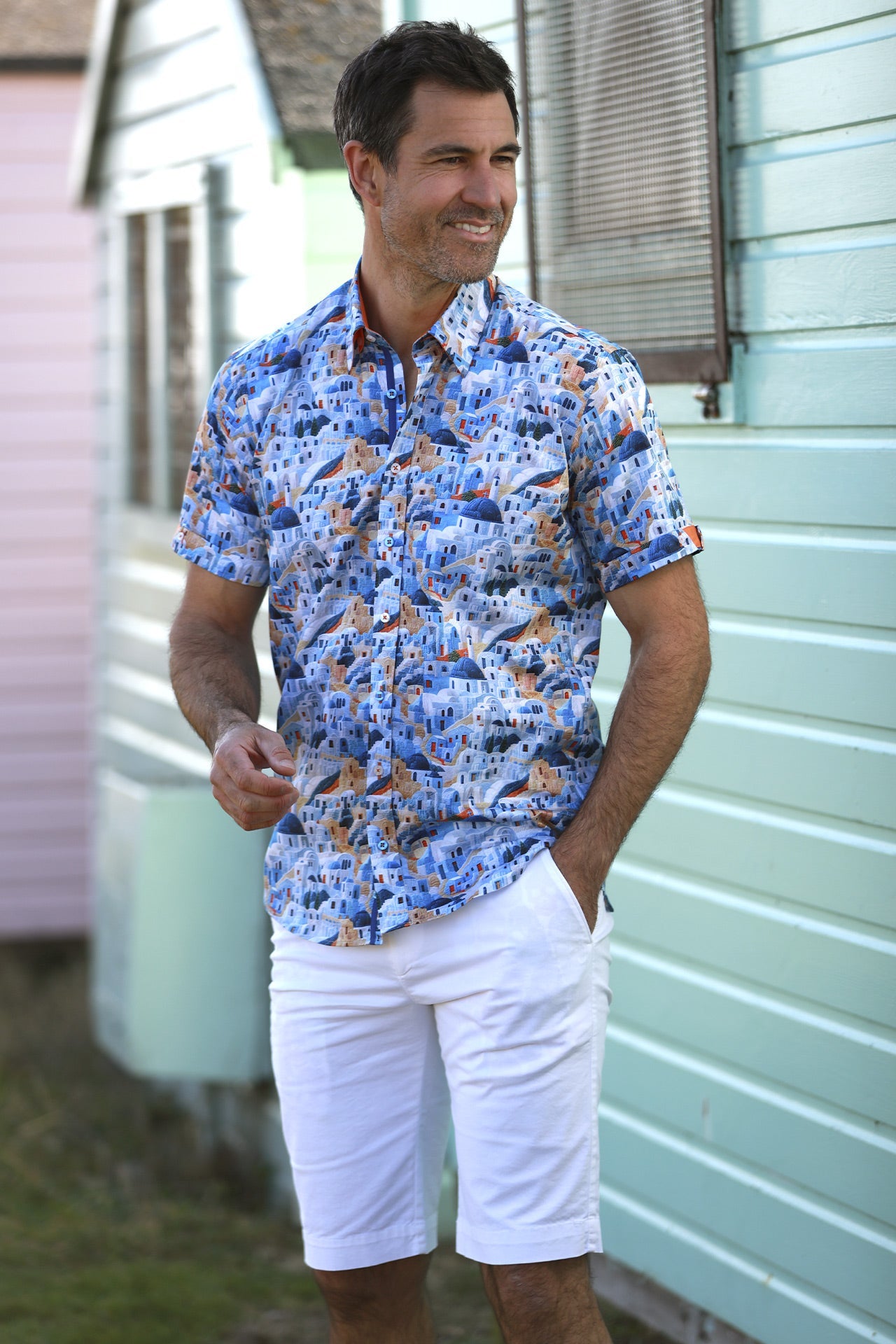 Experience sun-drenched charm in this men’s luxury cotton shirt, featuring a vivid Santorini skyline with whitewashed houses and ocean-blue domes. Crafted from premium breathable cotton, this short sleeve staple is your ultimate summer getaway companion — perfect for sun-soaked strolls, beach bar lounging or smart casual events. Finished with statement contrasting cuffs and a tailored fit, it’s a must-have for stylish adventurers.