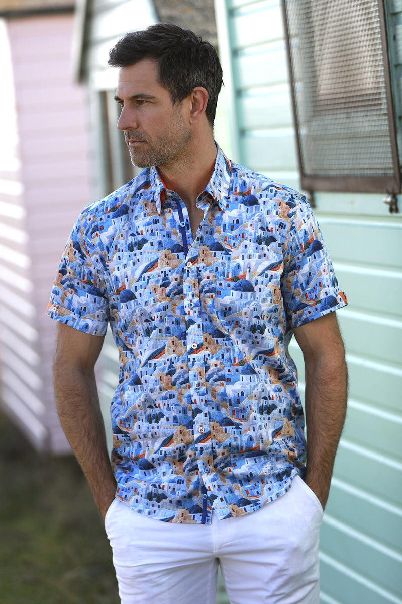 ESCAPE TO SANTORINI PRINTED SHORT SLEEVE SHIRT