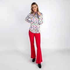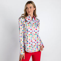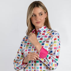 Add a vibrant splash to your wardrobe with the Colour Codes Women's Print Shirt. This eye-catching piece features a playful grid of multicolored squares, reminiscent of a painter's palette, perfect for those who love to make a statement.