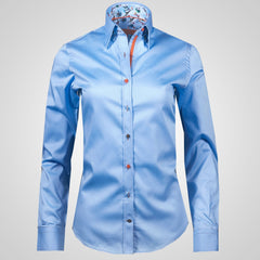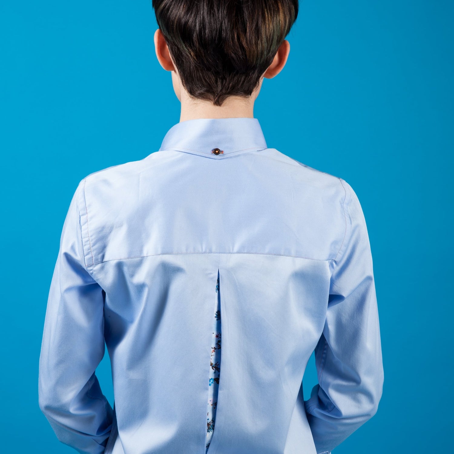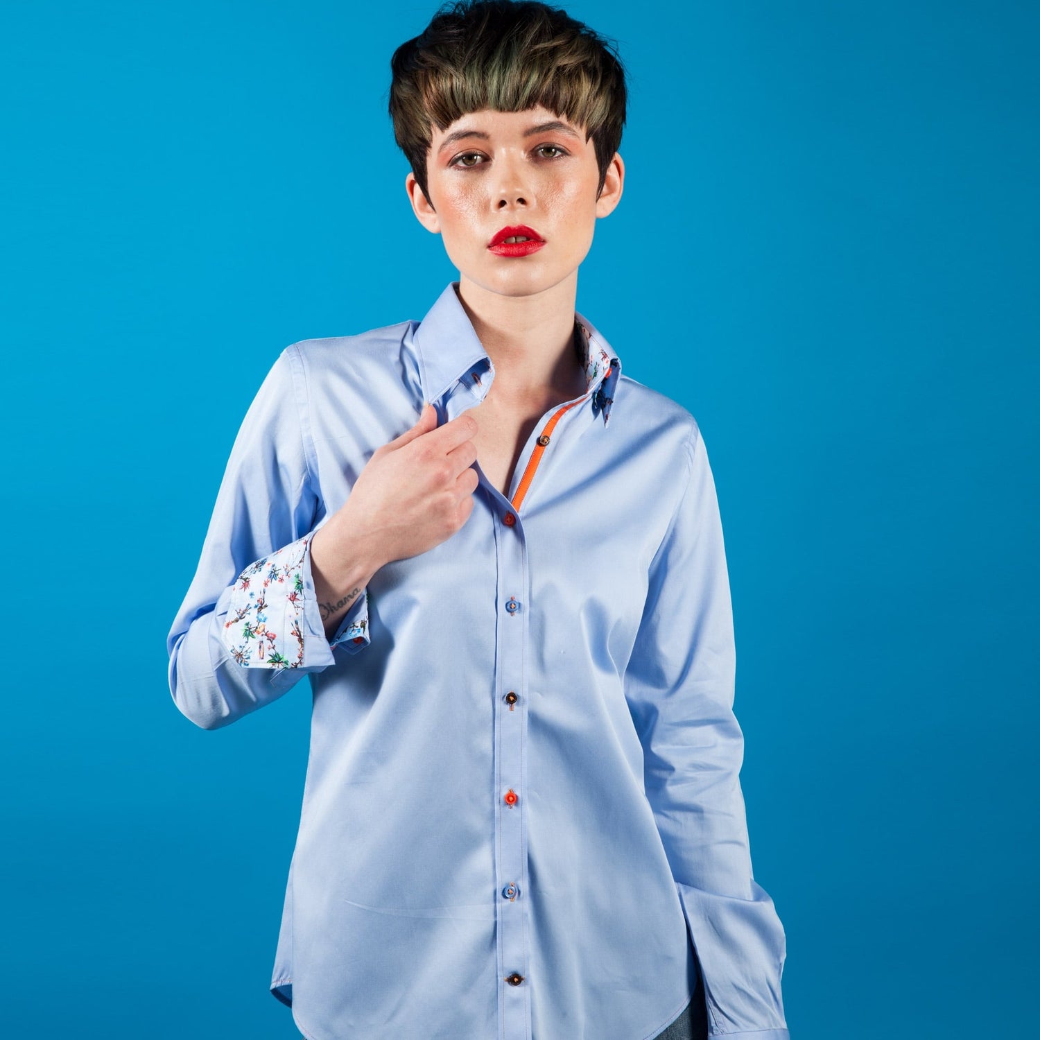 Introducing the Claudio Lugli Classic Sky Fairy Light Women’s Shirt, crafted from a soft satin-cotton blend for ultimate comfort and style. This elegant sky-blue shirt features contrasting floral cuffs and inner collar details, adding a playful touch to its classic silhouette.