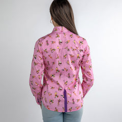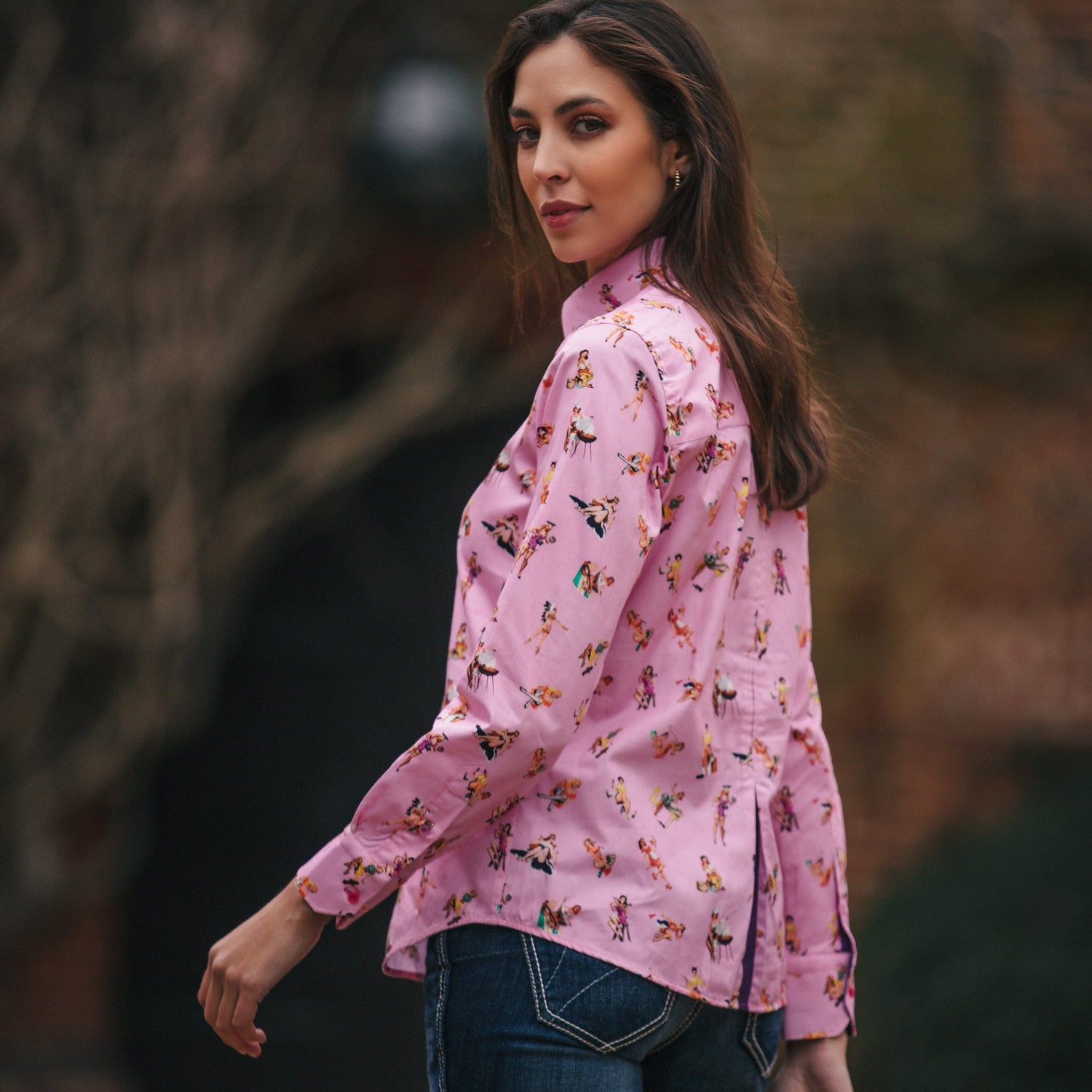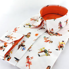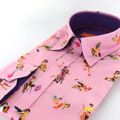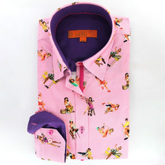 Step into the spotlight with the "Femme Fatale" Pin-Up Girls Women's Print Shirt. This playful yet sultry shirt is a nod to the golden age of pin-up girls, featuring a captivating print of iconic femme fatales on a soft, pink satin-cotton blend. Perfect for making a bold fashion statement, whether you're heading to a retro-themed party or just want to add some vintage flair to your everyday wardrobe.