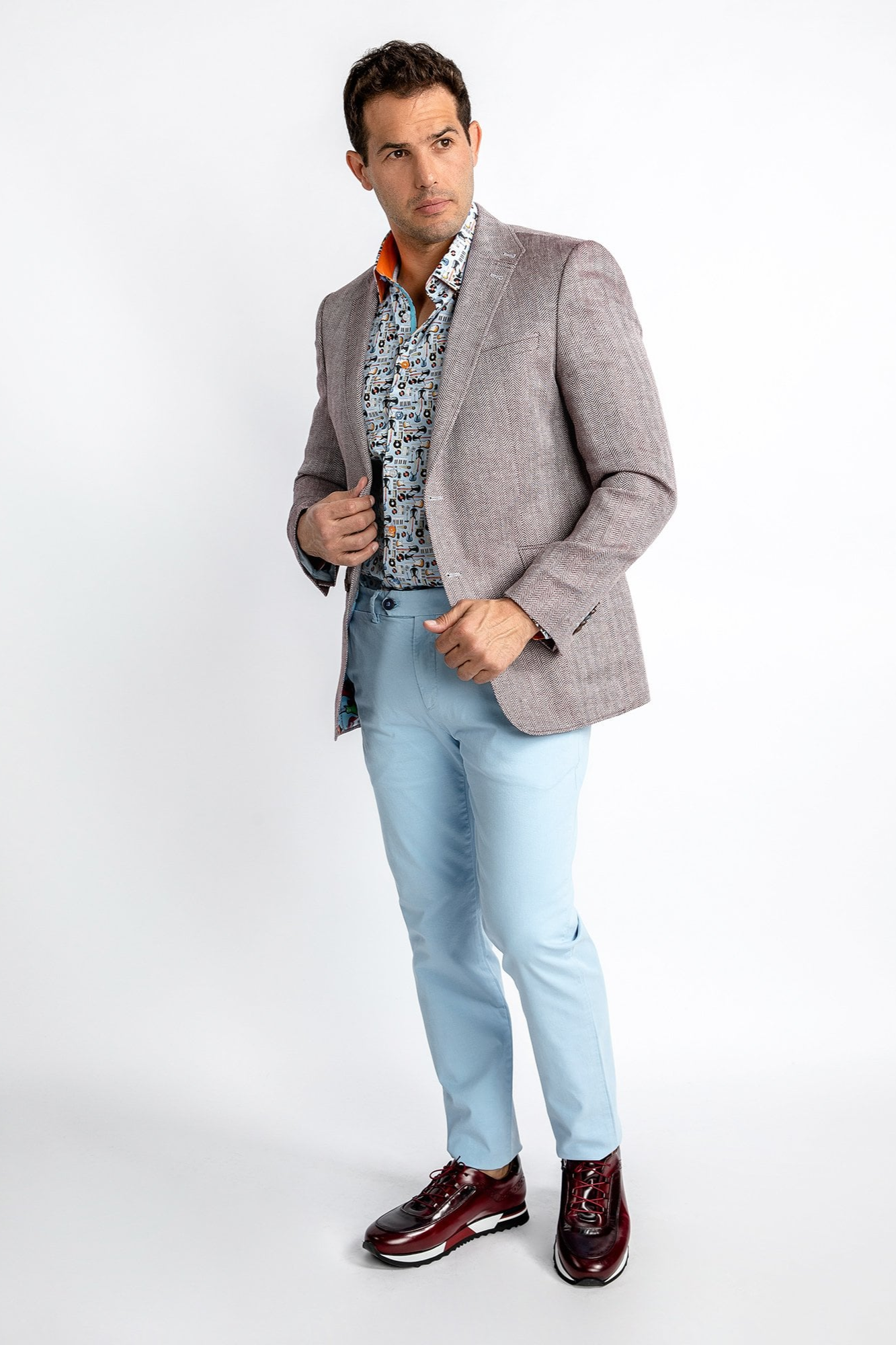 Elevate your summer wardrobe with the Herringbone Lightweight Linen Summer Jacket. Crafted from 100% luxurious linen, this jacket is the epitome of sophistication and comfort. The intricate herringbone pattern adds depth and character, showcasing refined craftsmanship. Designed for versatility, it pairs effortlessly with jeans, chinos, or tailored trousers, making it perfect for both formal and casual occasions.