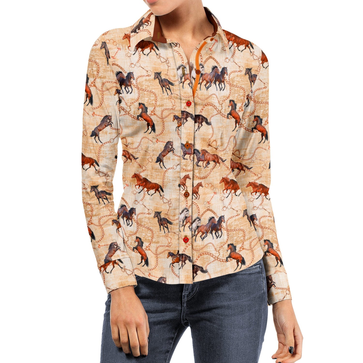 Gallop into style with the "Horses & Bridles" Women's Print Shirt. This shirt is a celebration of equestrian beauty, featuring a stunning array of horses and intricate bridles dancing across a warm, rustic backdrop. Crafted from a luxurious satin-cotton blend, this shirt offers a silky smooth feel and a flattering fit that’s perfect for any occasion.