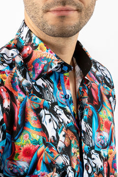 Dive into a world of myth and majesty with the Claudio Lugli Horses of Neptune Print Shirt. This stunning piece features an intricate design inspired by the legendary steeds of the sea god Neptune, brought to life with vibrant, swirling colors and bold imagery. Crafted from premium satin cotton, this shirt offers a luxurious feel and a captivating visual impact.