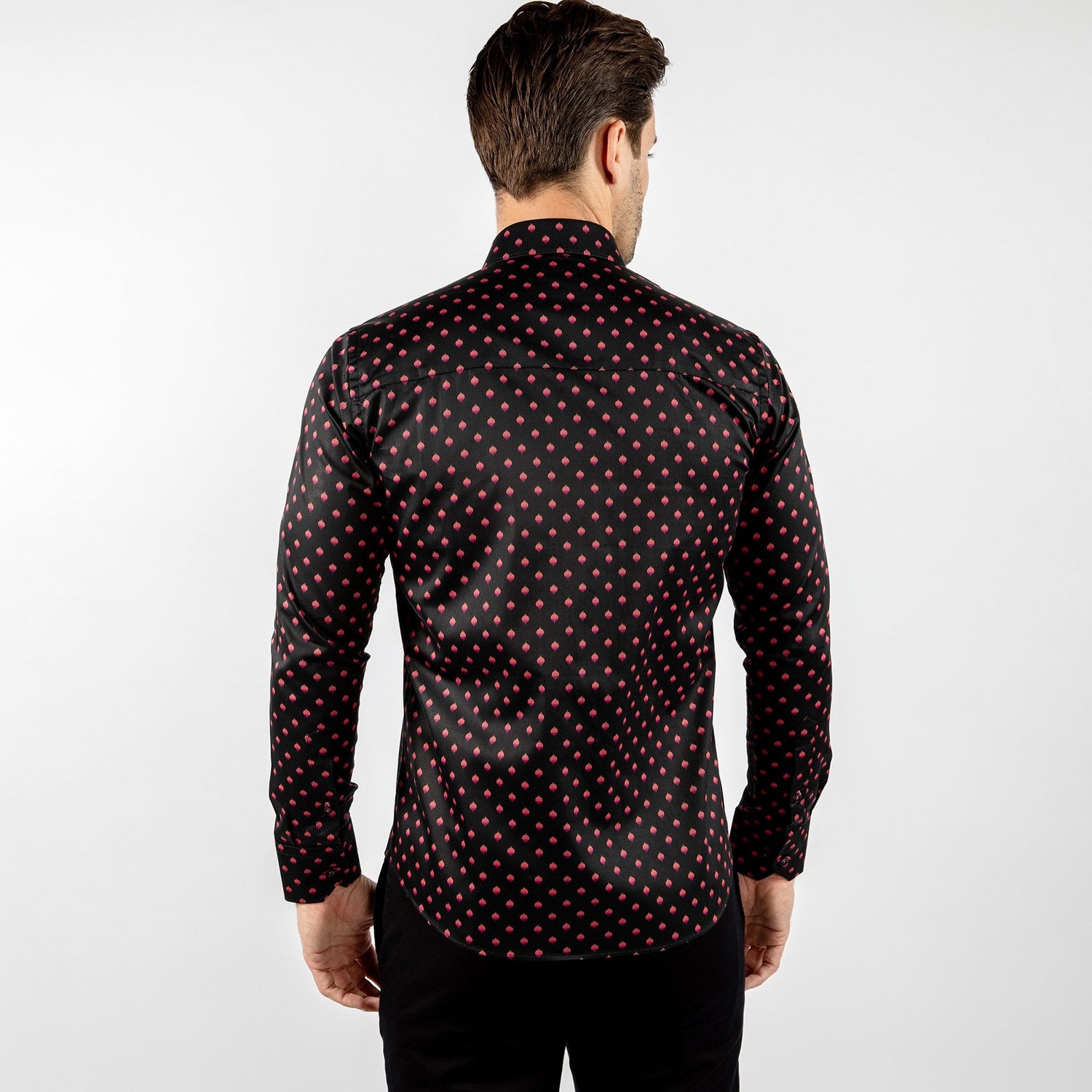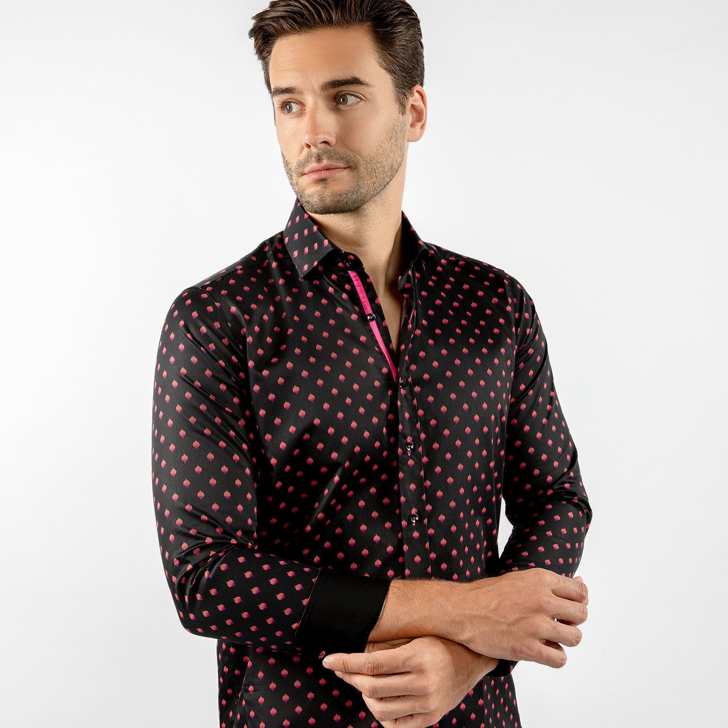 Illuminate your style with the "Midnight Club: Lantern Print Shirt." This distinctive design showcases a pattern of vibrant pink lanterns set against a deep black backdrop, evoking a sense of mystery and nocturnal elegance. Perfect for evening adventures or upscale gatherings, this shirt is a bold statement of confidence and refined taste.