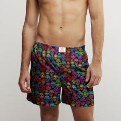 These 100% cotton poplin boxer shorts feature a vibrant and edgy skull print, perfect for adding a bold statement to your everyday essentials. The multi-colored skull design stands out against a black background, offering a striking contrast that’s both stylish and unique. The soft, breathable fabric ensures all-day comfort, while the elastic waistband provides a snug yet flexible fit. Ideal for those who appreciate a touch of daring in their wardrobe, these boxers combine quality craftsmanship with eye-catching design, making them a standout piece in any underwear collection.