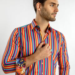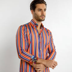 Embrace a burst of colour with the Stripe Multicolour Print Shirt. This vibrant shirt features an array of vertical stripes in bold, striking hues, perfect for those looking to make a lively style statement. The playful combination of colours is both eye-catching and sophisticated, making it a versatile choice for any occasion.