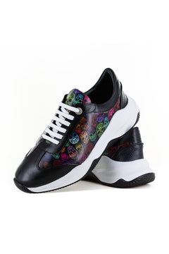 Turn heads and bring a splash of edge to your footwear collection with these Multicoloured Skull Print Leather Trainers. Crafted from luxurious leather, these trainers feature a vibrant skull print that gives off a rebellious yet stylish vibe. The lively colours against the sleek black backdrop create a striking contrast, perfect for those who love to mix boldness with sophistication.