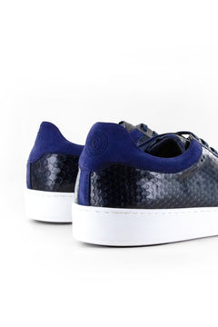 Make a bold statement with these Reptile Texture Leather Classic Sneakers. The deep navy leather, featuring an eye-catching reptilian texture, is paired with soft suede accents for a luxurious feel. These sneakers are designed to add a touch of the exotic to any outfit, making them a versatile yet striking addition to your wardrobe.