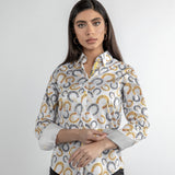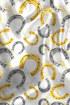 Step into a world of equestrian elegance with the "Ornate Horseshoe Collection Women’s Print Shirt." Featuring an intricate design of golden and silver horseshoes, this shirt is a stylish nod to luck and luxury. Crafted from a sumptuous satin-cotton blend, it offers a silky-smooth feel, ensuring you stay comfortable while making a chic statement.