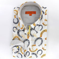 Perfect for a day at the races or a countryside retreat, this shirt pairs beautifully with tailored trousers or classic black jeans. The intricate horseshoe pattern adds a touch of sophistication, making it ideal for both casual outings and more polished occasions. Whether you’re an equestrian enthusiast or simply love a unique, eye-catching print, this shirt is your go-to piece for effortless elegance. Saddle up your style and embrace the luck of the draw!