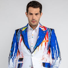 Introducing the Claudio Lugli Paint Drip 2 Piece Suit—a bold statement in modern fashion. Featuring a unique paint drip design, this suit creates the illusion of multicolored paint cascading down from the jacket to the trousers, exuding confidence and artistic flair. Crafted from mid-weight, smooth, and textured fabric, it offers both comfort and luxury. The structured two-button front, jetted front pocket, and five kissing buttons with contrast buttonholes add sophisticated details.