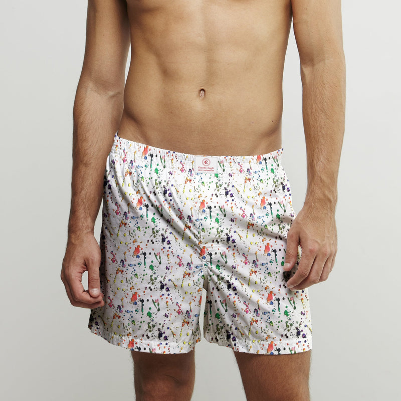 These 100% cotton poplin boxer shorts feature a lively and dynamic paint splash design, making them a perfect choice for those who love to express their artistic side. The multicoloured splatter pattern, set against a crisp white background, adds a burst of creativity and fun to your underwear collection. The lightweight and breathable cotton poplin fabric ensures all-day comfort, while the elastic waistband provides a snug and flexible fit. Ideal for adding a touch of boldness and individuality to your everyday essentials, these boxer shorts are both stylish and comfortable.