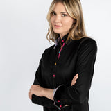 This classic ladies' shirt features a sleek and sophisticated design, perfect for both formal and casual occasions. The shirt is crafted from high-quality fabric, ensuring a comfortable fit and lasting durability. It has a black base with colourful accents, including contrasting buttons and stitching, adding a subtle yet stylish touch to the overall look. The shirt is tailored with a traditional collar and button-down front, making it a versatile piece that can be dressed up or down depending on the occasion. Ideal for pairing with trousers, skirts, or jeans, this shirt is a wardrobe essential for any fashion-conscious individual.