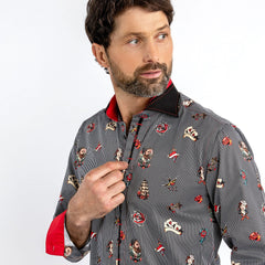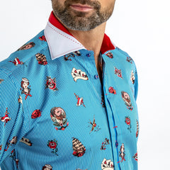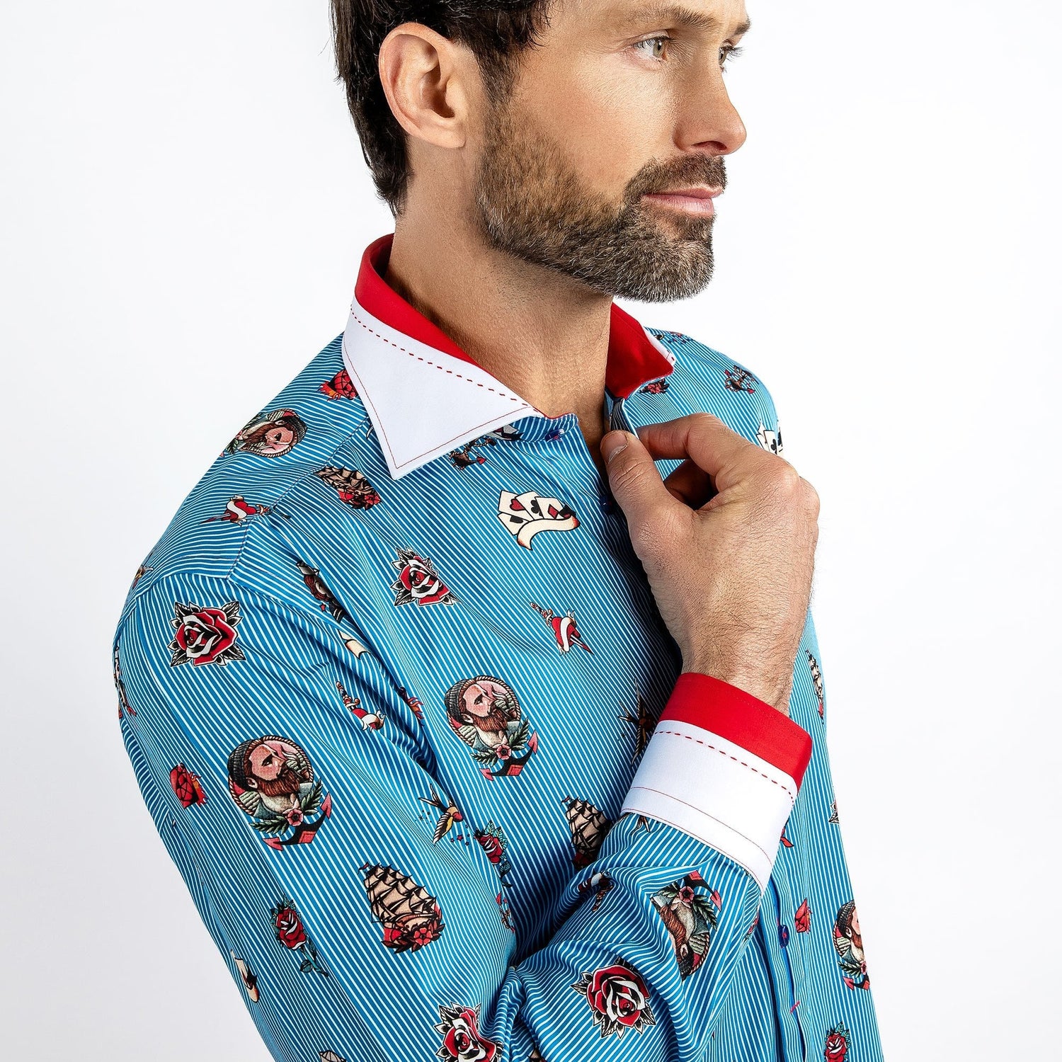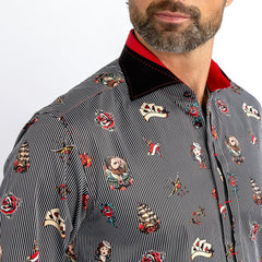 Make a bold statement with the Claudio Lugli Sailor Punk Tattoo Print Shirt. This unique shirt features an eye-catching design inspired by classic sailor tattoos, blending punk aesthetics with nautical motifs. Crafted from a luxurious satin and cotton blend, it offers both comfort and style. The shirt is adorned with intricate tattoo-inspired designs, including ships, anchors, and roses, all set against a striped background that adds a touch of sophistication. The contrasting collar and cuffs in vibrant red and black enhance the edgy look. Perfect for those who want to express their individuality, this shirt is a true conversation starter.