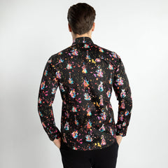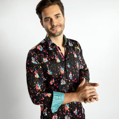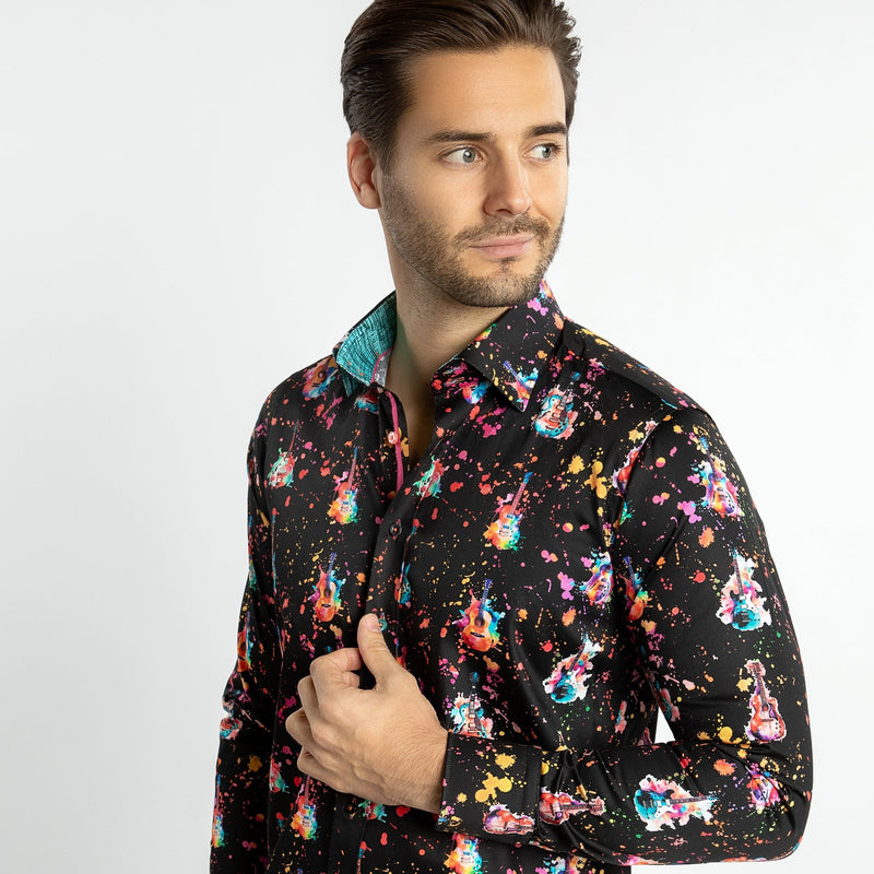 Strike a chord with the Claudio Lugli Splash Guitar Print Shirt. This vibrant, long-sleeved shirt features an explosion of multicolored guitars and splatters, capturing the essence of musical passion and artistic flair. Crafted from a premium satin-cotton blend, it offers a luxurious feel and a comfortable fit. The contrasting cuffs and button placket add a touch of sophistication to this bold, statement piece. Whether you're hitting the stage or making an entrance at a casual gathering, this shirt ensures you'll be the center of attention. Unleash your inner rockstar and let your style play on with this unforgettable design.