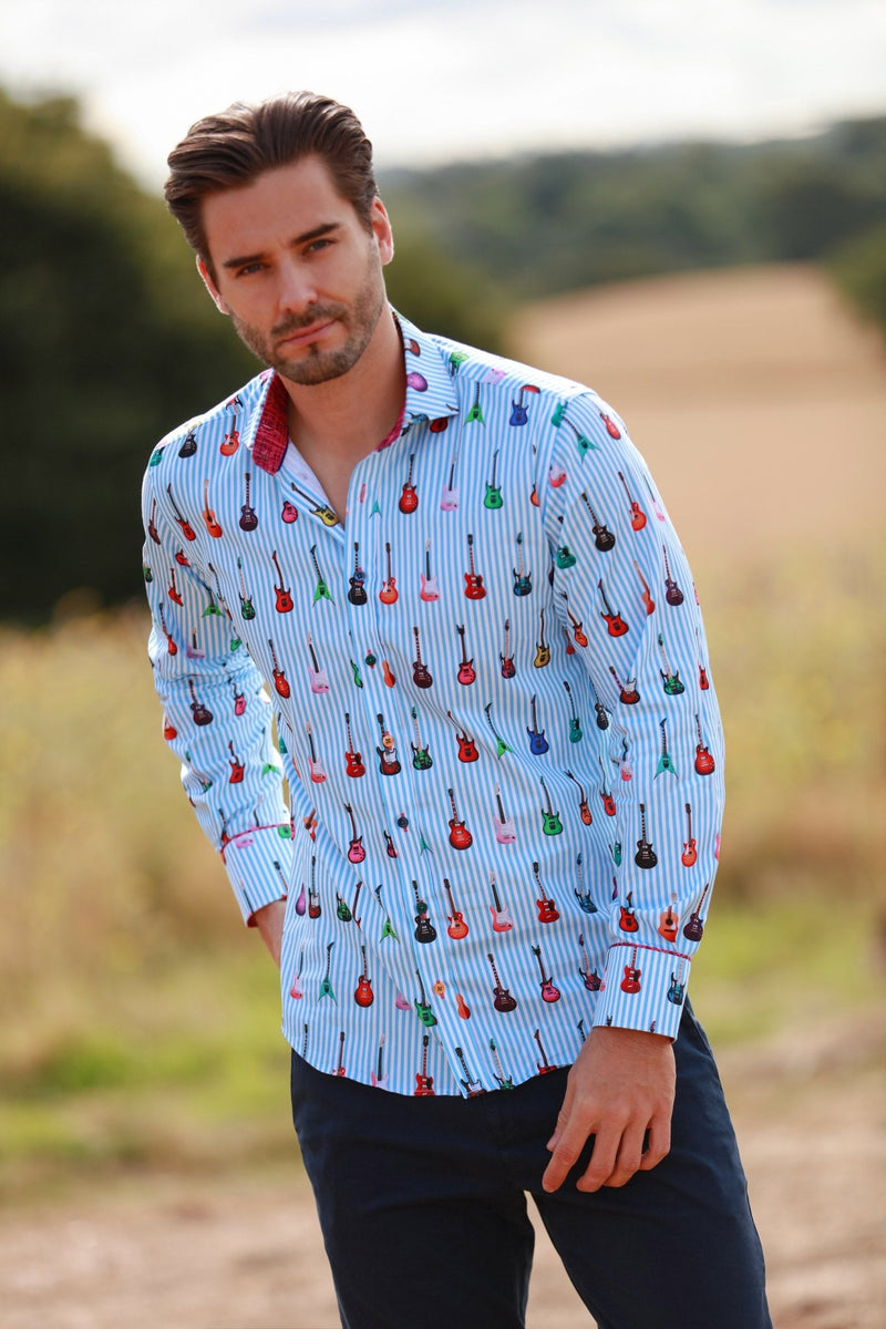 Elevate your style with the Stripe Guitar Print Shirt, available in blue, navy, and fuchsia. This shirt features a lively pattern of multicoloured guitars set against classic pinstripes, perfect for the music enthusiast or anyone who loves a bold, playful look. Crafted from premium materials, it offers a comfortable fit with a hint of stretch, making it versatile for both casual outings and stylish events. The vibrant print ensures you’ll stand out, while the quality construction guarantees lasting wear. Pair it with chinos or jeans for a fun, fashionable ensemble that resonates with your unique personality.