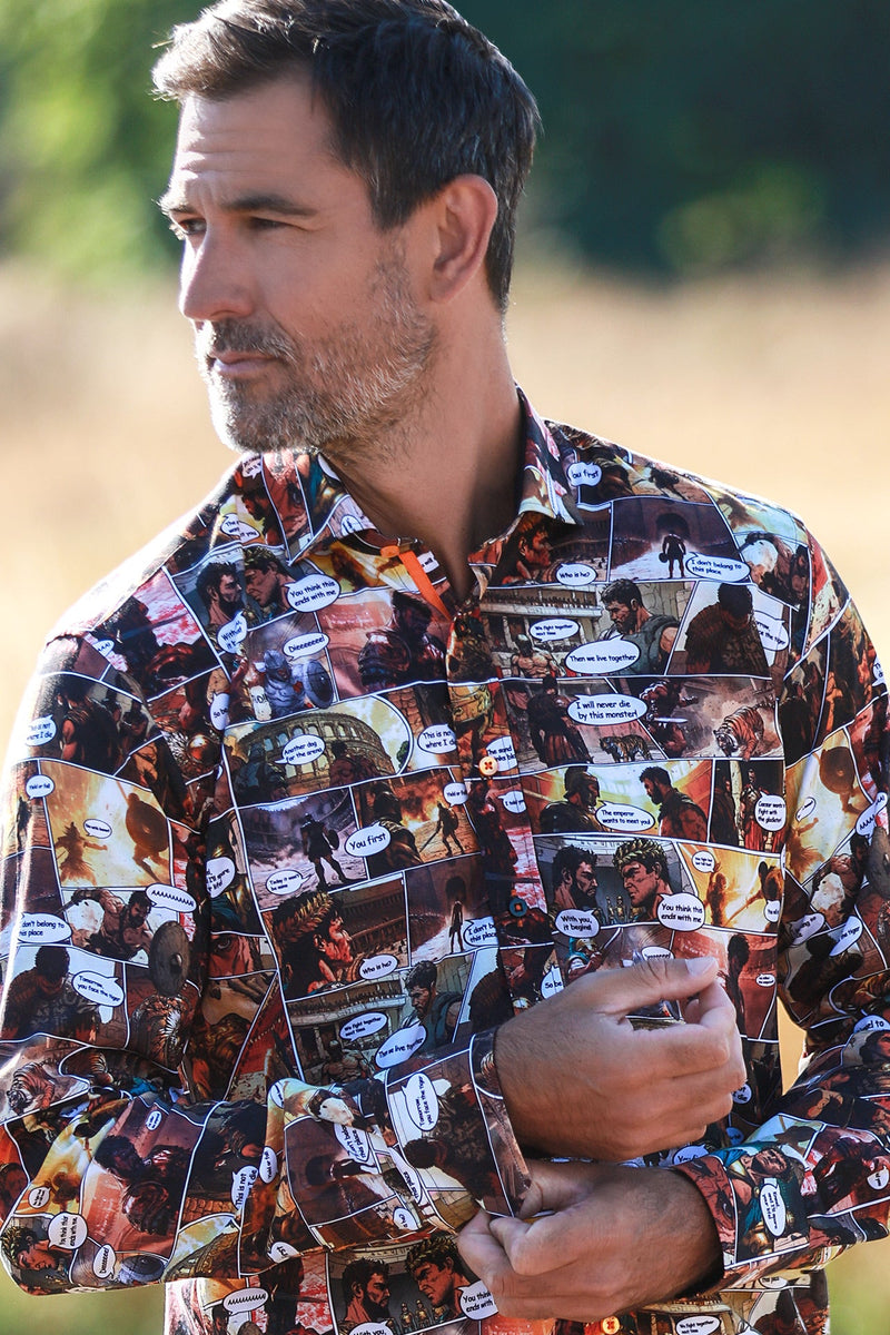 Step into the arena of style with this commanding Tencel gladiator print shirt. Crafted for the modern warrior who understands that strength and honor aren't just words—they're a way of life.