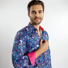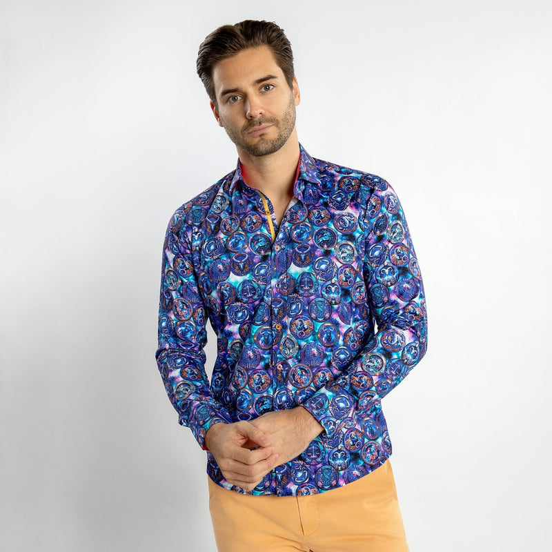 Adorned with intricately designed zodiac icons within circular coins against a mesmerizing space-themed backdrop, this shirt is an astrological masterpiece. Bold hot fuchsia accents on the cuffs and collar add modern flair, while the golden placket and circular gold buttons exude opulence. Multicolored buttonhole stitching mirrors the colorful tape, adding playful sophistication.